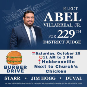 Hebronville, Tx.- Todas las familias de Hebronville y de las comunidades cercanas del Condado Jim Hogg están invitadas al Burger Drive que ofrecerá este sábado 25 de octubre Abel Villarreal Jr., candidato a Juez del Distrito 229.