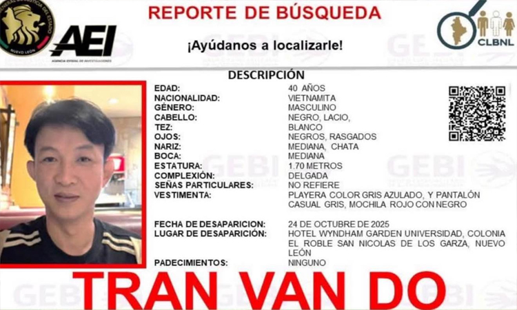 Tamaulipas.- La Fiscalía General del Estado de Nuevo León, junto con autoridades de Tamaulipas, confirmó que el vietnamita Tran Van Do, de aproximadamente 40 años de edad, que había desaparecido el pasado 24 de octubre después de salir de un hotel en San Nicolás de los Garza, fue localizado con vida en Miguel Alemán.