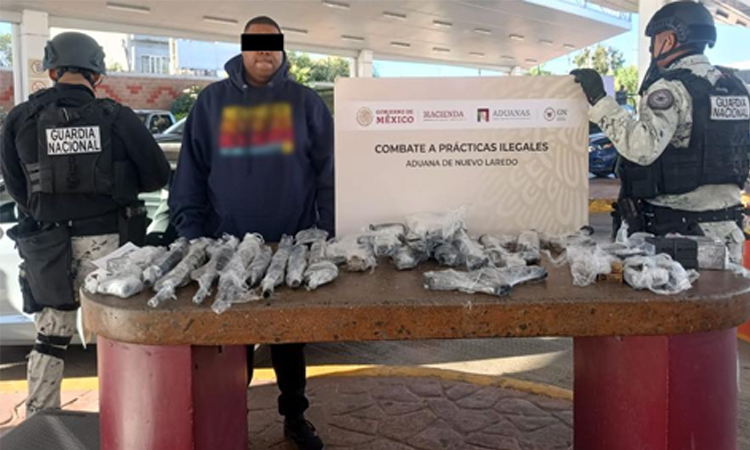Nuevo Laredo, Tam.- Elementos de la Guardia Nacional asignados en la Aduana de Nuevo Laredo, detuvieron a un masculino que intentó introducir a México un cargamento de armas largas.